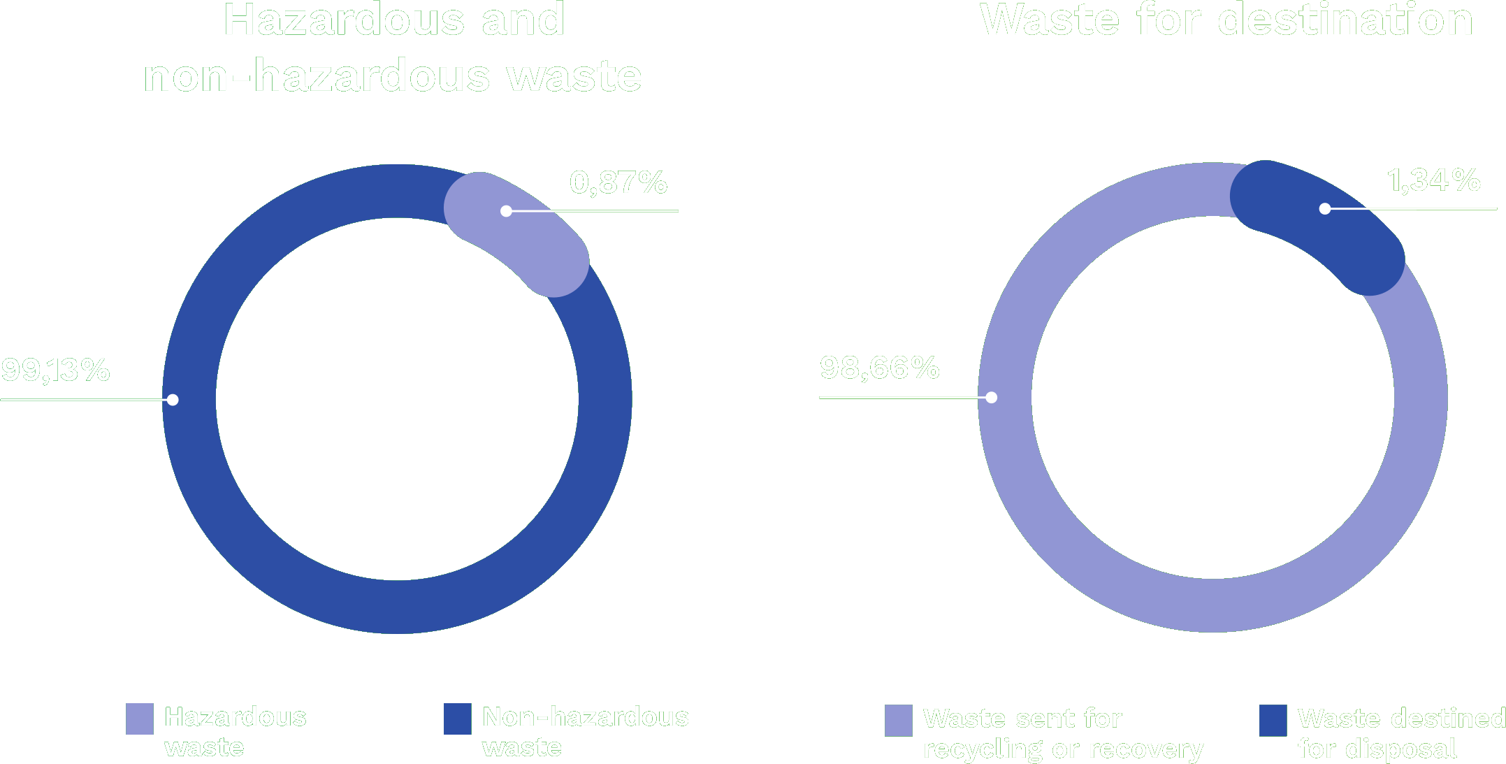 During the year, Fonderia Silvestri generated a total of 757.78 tons of waste. Of this, only 6.6 tons (0.87%) is classified as hazardous waste, while almost all of it, 751.18 tons (99.13%), is non-hazardous waste.