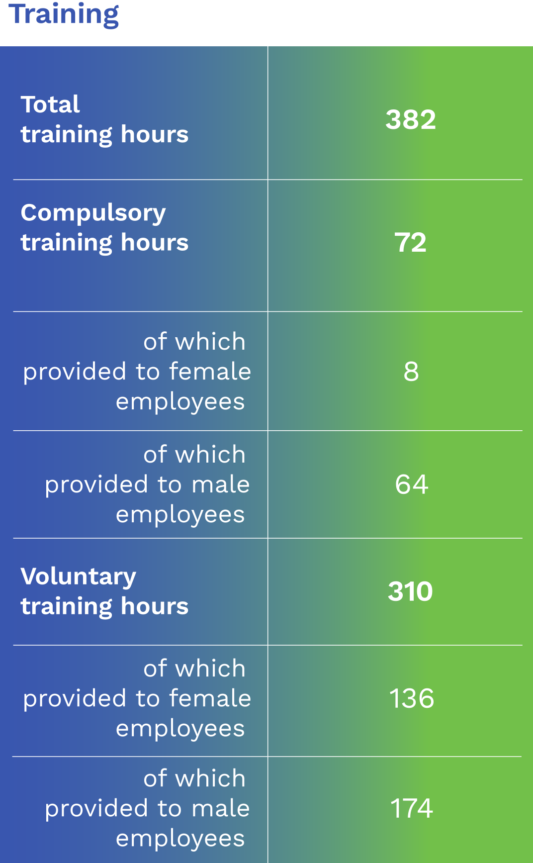 The significant investment in training is a positive indicator of the level of attention that the organization devotes to skills development, prevention, and workplace safety, contributing to professional growth and the enhancement of human resources.